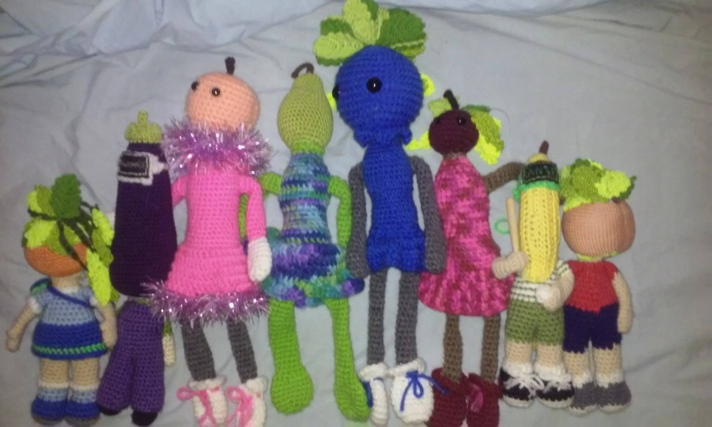 Four colorful plush toy dolls with big eyes, pink, blue, black, and green in color.